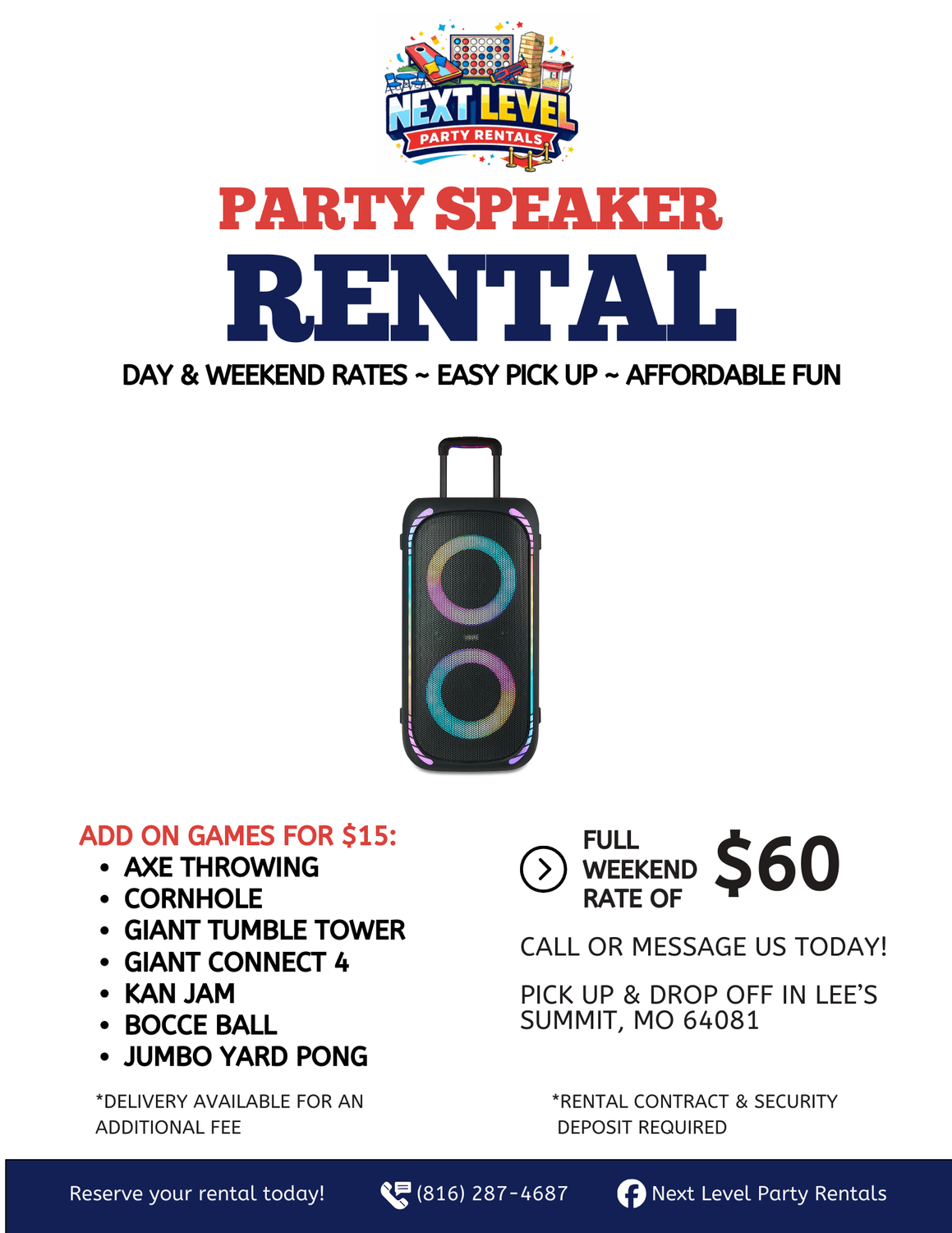 We understand accidents happen! In the event of damage, loss, or theft of the Equipment, the Renter will be charged for the full cost of repair or replacement, as determined solely by Next Level Party Rentals LLC per the rental contract.