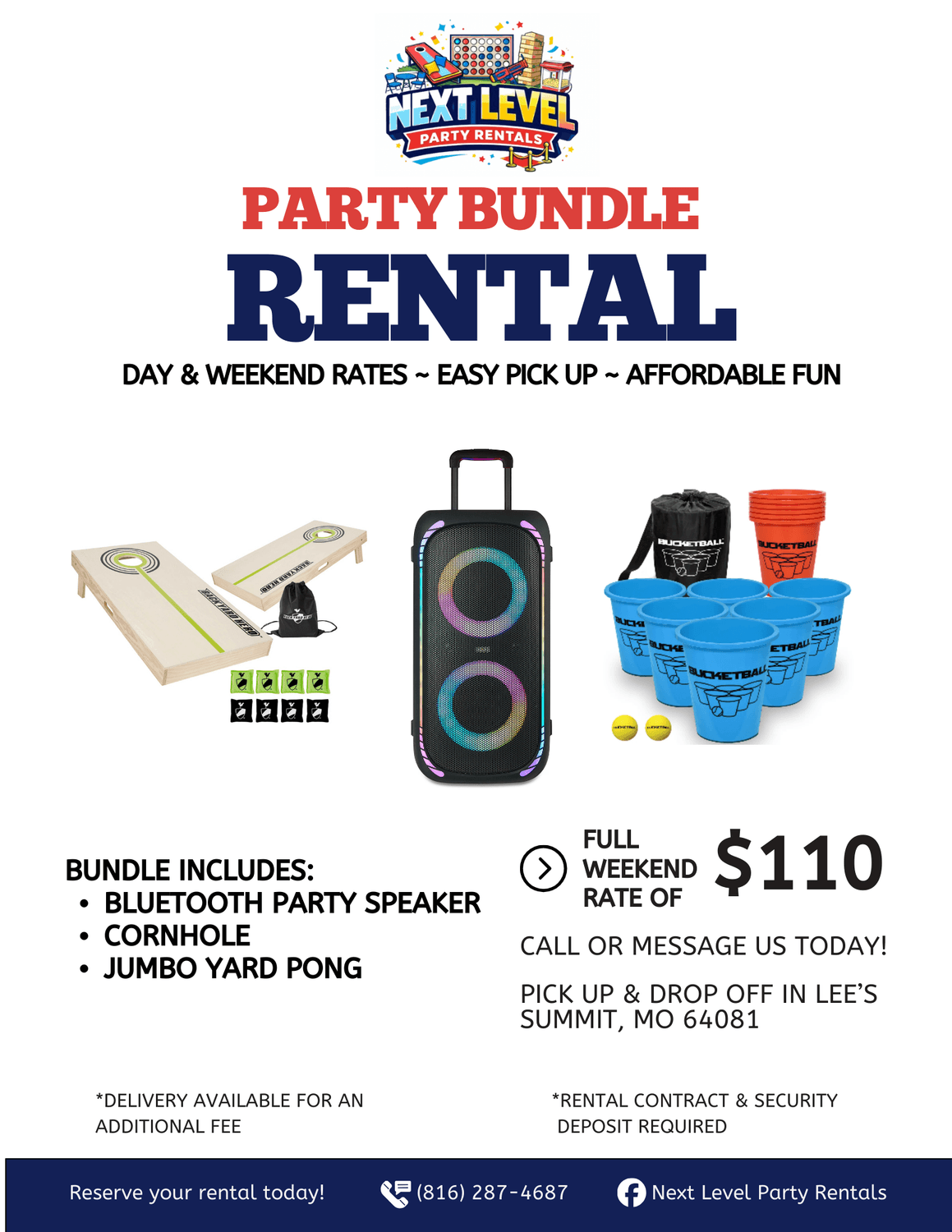 Are you looking for table & chair or yard game rentals in the Kansas City Metro? Well, look no further! Next Level Party Rentals LLC is your one-stop solution to take your upcoming party, family gathering, or tailgate to the next level. We offer a wide variety of yard games you can rent for the day or the weekend as well as tables & chair rentals. Contact us today to see how we can bring the fun to your next event!